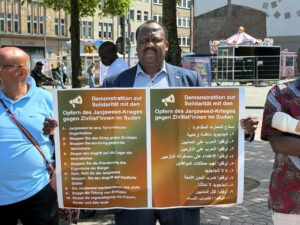 وقالت الجالية في خطابها التي تم تلاوته في التظاهرة التي إقيمت في مدينة هانوفر ، إن مليشيا الدعم السريع، منذ اندلاع الحرب في 15 أبريل 2023، مارست عمليات قتل جماعي واغتصاب للنساء واختطاف للمدنيين، إلى جانب تدمير البنية التحتية والمرافق الحيوية مثل المدارس والمستشفيات ومصادر المياه والكهرباء.