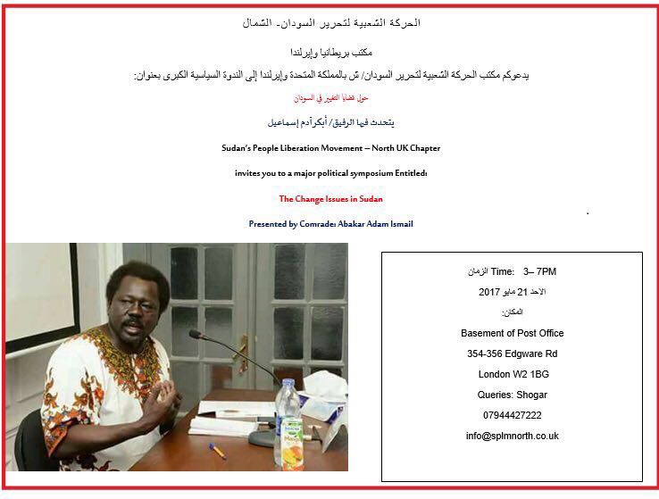 يدعوكم مكتب الحركة الشعبية لتحرير السودان/ش بالمملكة المتحدة وايرلندا إلى الندوة السياسية الكبرى بعنوان: